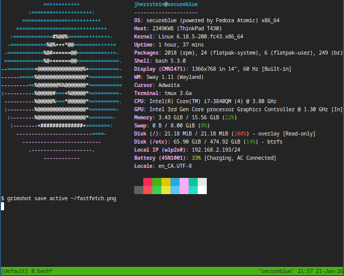 My current laptop is a Thinkpad T430 that got me through my last 11/2-ish years of undergrad. I bought it for $100 off of Kijiji in Summer 2023, and have spent more money on a few upgrades and repairs since then. I started with Qubes-OS to compartmentalize my workflows, and now I’m using Secureblue Sericea (Sway). I always love using window managers for efficiency on my laptops, I used AwesomeWM on Qubes and I now use Sway with Secureblue.